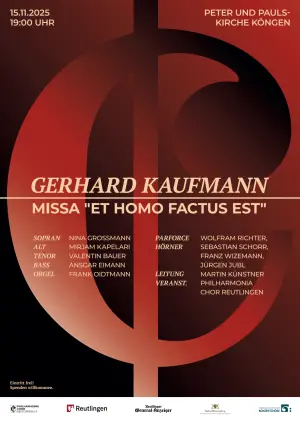 Konzert des Philharmonia Chor Reutlingen mit Gerhard Kaufmann‘s Missa „Et homo factus est“ in der ⇒ Peter− und PaulskircheMISSA „ET HOMO FACTUS EST“ FÜR CHOR, VIER PARFORCE − HöRNER UND ORGEL Die Worte der lateinischen Messe in Klang zu setzen, wie es in allen Jahrhunderten getan wurde, ist eine Auseinandersetzung, die immer auf der aktuellen Höhe der Zeit geschieht. Auch heute im 21. Jahrhundert spüren wir die Ereignisse und wie wir uns auf sie beziehen und wie sie uns betreffen. Mitten darin zu leben, aber inne zu halten, ob doch dieser alte Text ein weiteres Mal neu mit Musik zur Frage „Was ist der Mensch“ vordringen kann, das leuchtet in den Klangbildern bei Gerhard Kaufmanns Messe auf und setzt uns alle als Menschen in einen erregenden Bezug zur Gegenwart. Beteiligt sind: Sopran Nina Grossmann, Alt Mirjam Kapelari, Tenor Valentin Bauer, Bass Ansgar Eimann, Parforce Hörner Wolfram Richter, Sebastian Schorr, Franz Wizemann, Jürgen Jubl, Orgel Frank Oidtmann, Leitung Martin Künstner, Veranstalter Philharmonia Chor Reutlingen Der Eintritt ist frei − Spenden zur Unterstützung der Arbeit des Philharmonia Chors Reutlingen sind herzlich willkommen! |