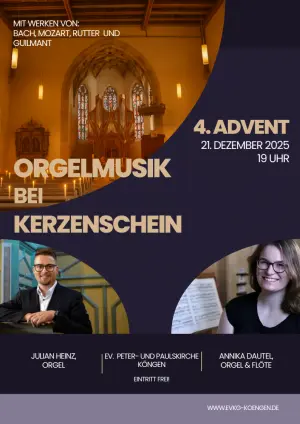 Orgelmusik mit Julian Heinz bei Kerzenschein (Orgel+Blockflöte) in der ⇒ Peter− und PaulskircheZum 4. Advent lädt die Evangelische Kirchengemeinde Köngen herzlich zu einem Konzert mit Julian Heinz und Annika Dautel ein. Zu hören sind Werke von Bach, Mozart, Rutter, Guilmant und weiteren Komponisten. Das Programm reicht von Orgelstücken solo über vierhändige Werke bis hin zu Musik für Orgel und Blockflöte. Mal feierlich, mal ruhig. Die Musik lädt ein, die Adventsstimmung bewusst zu erleben und für einen Moment den Alltag hinter sich zu lassen. Herzliche Einladung, der Eintritt ist frei. |