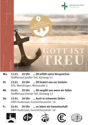 Allianzgebetswoche GOTT IST TREUIm Kudersaal des ⇒ Gustav−Werner−Gemeindehaus, Gunzenhauserstraße 16 … Auch in schweren Zeiten |